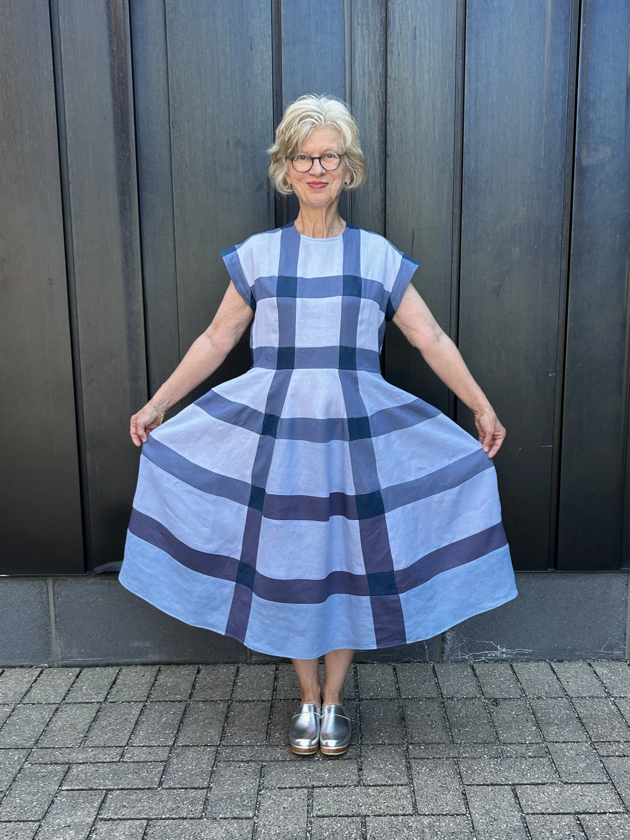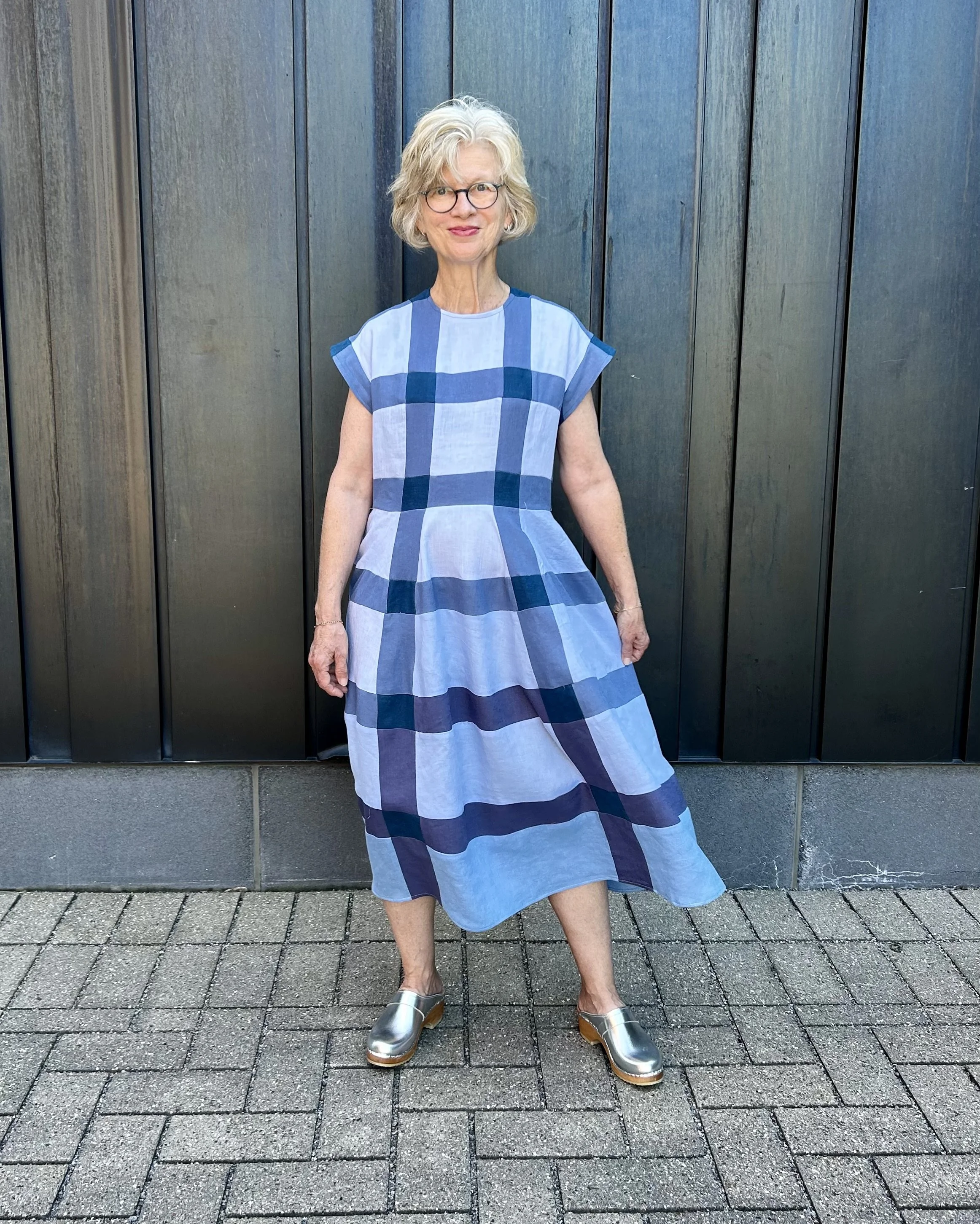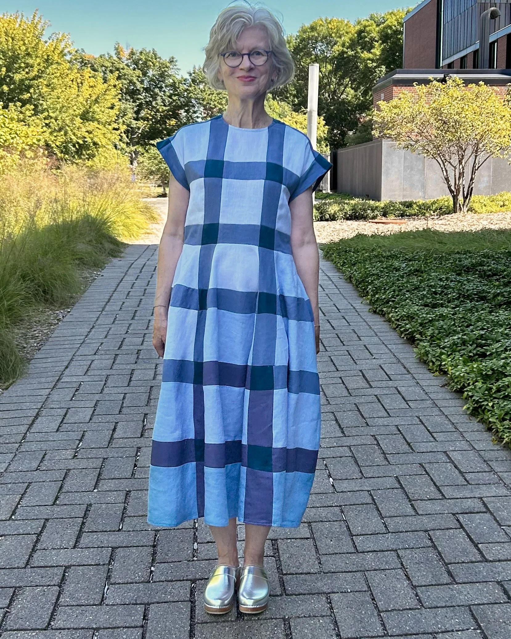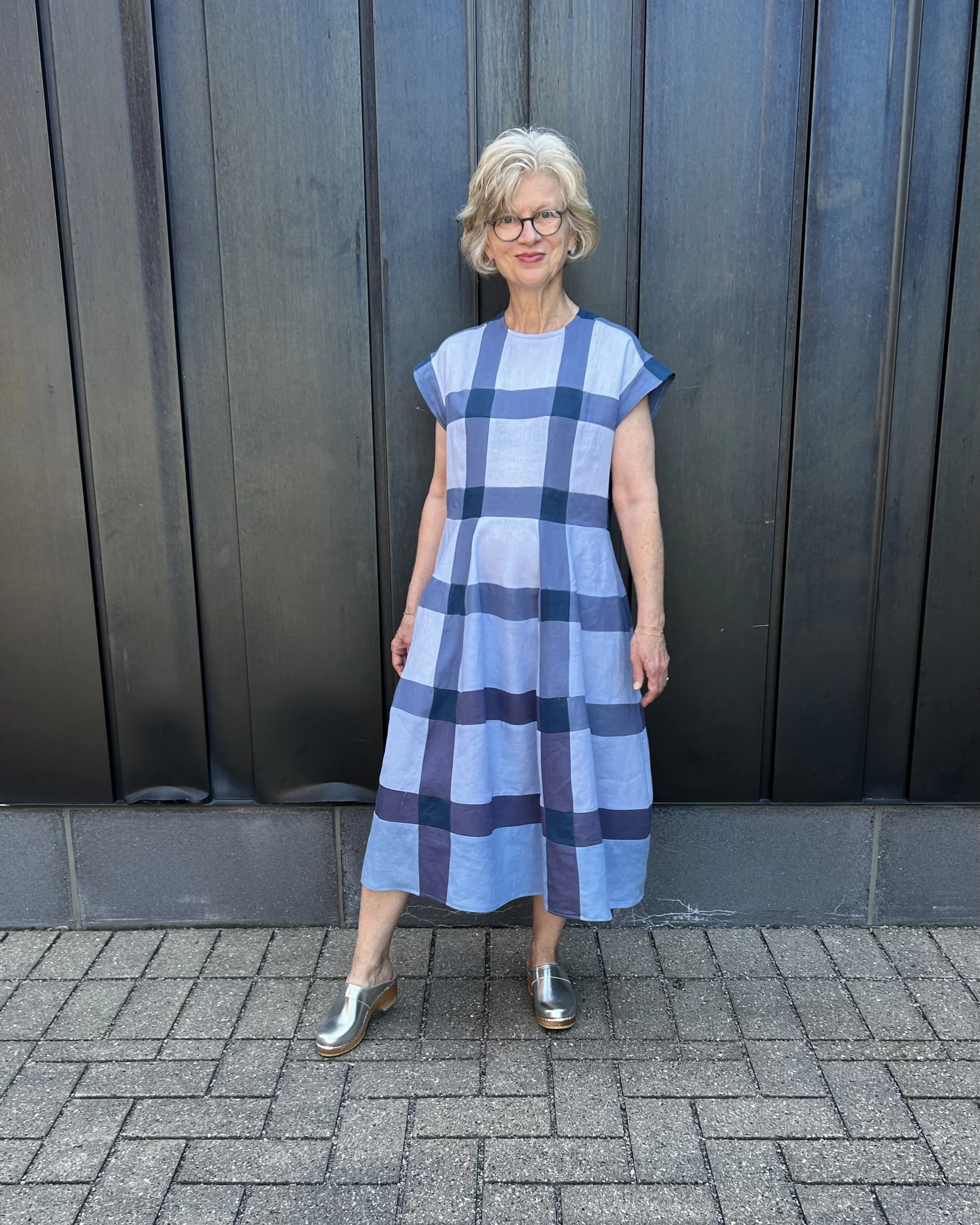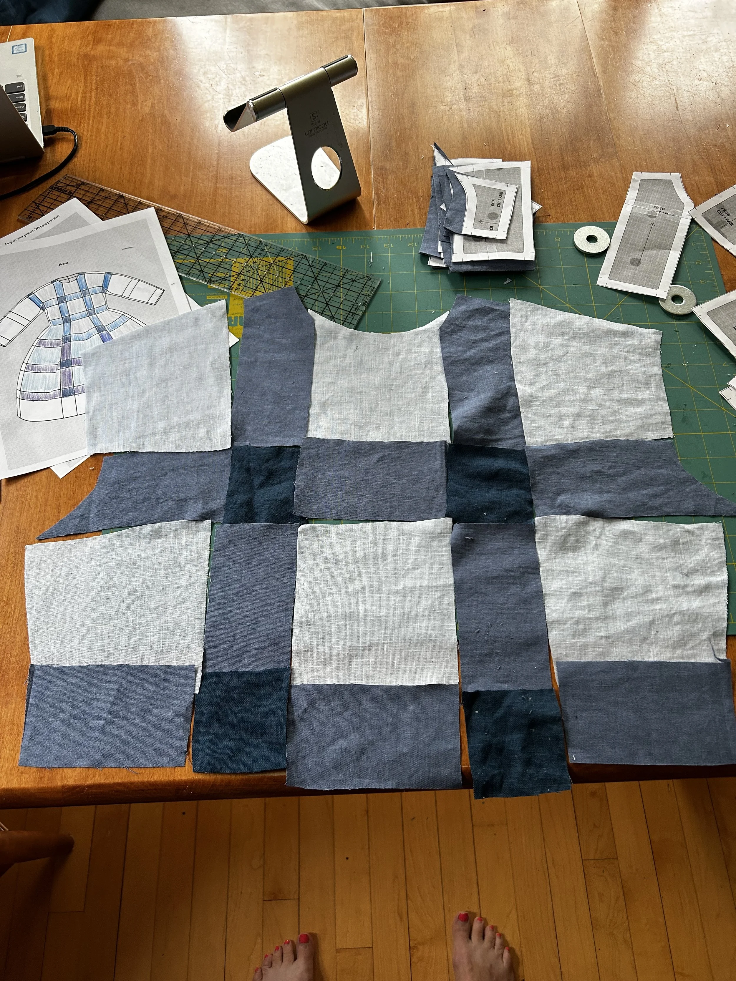 Here’s a rough outline and my first draft: I printed the pattern at home and taped the pattern pieces together. There are over 100 pieces all labelled by code. and they are mostly small and super manageable in scale. The pattern includes a plan for using three colors of fabric and some variations on how to implement a three color color-scheme. There is approximate yardage use provided if you make the dress from three fabrics. My plan was to use linen scraps and remnants so I had more than three fabrics to work into the design and I spent a few days head scratching on colors and placement. I ended up with six different colors. The pattern includes a coloring sheet to help visualize. I think some people are born with color genius- but I struggle. I have an artist friend who once told me that all shades of blue look good together- even if some lean green and some lean violet- which was the case with my fabric. I had a lot of fabric on hand, but in order to get a grid effect with lights and darks, I ended up purchasing two small amounts of blue linen - approximately one yard total from the local shops.
