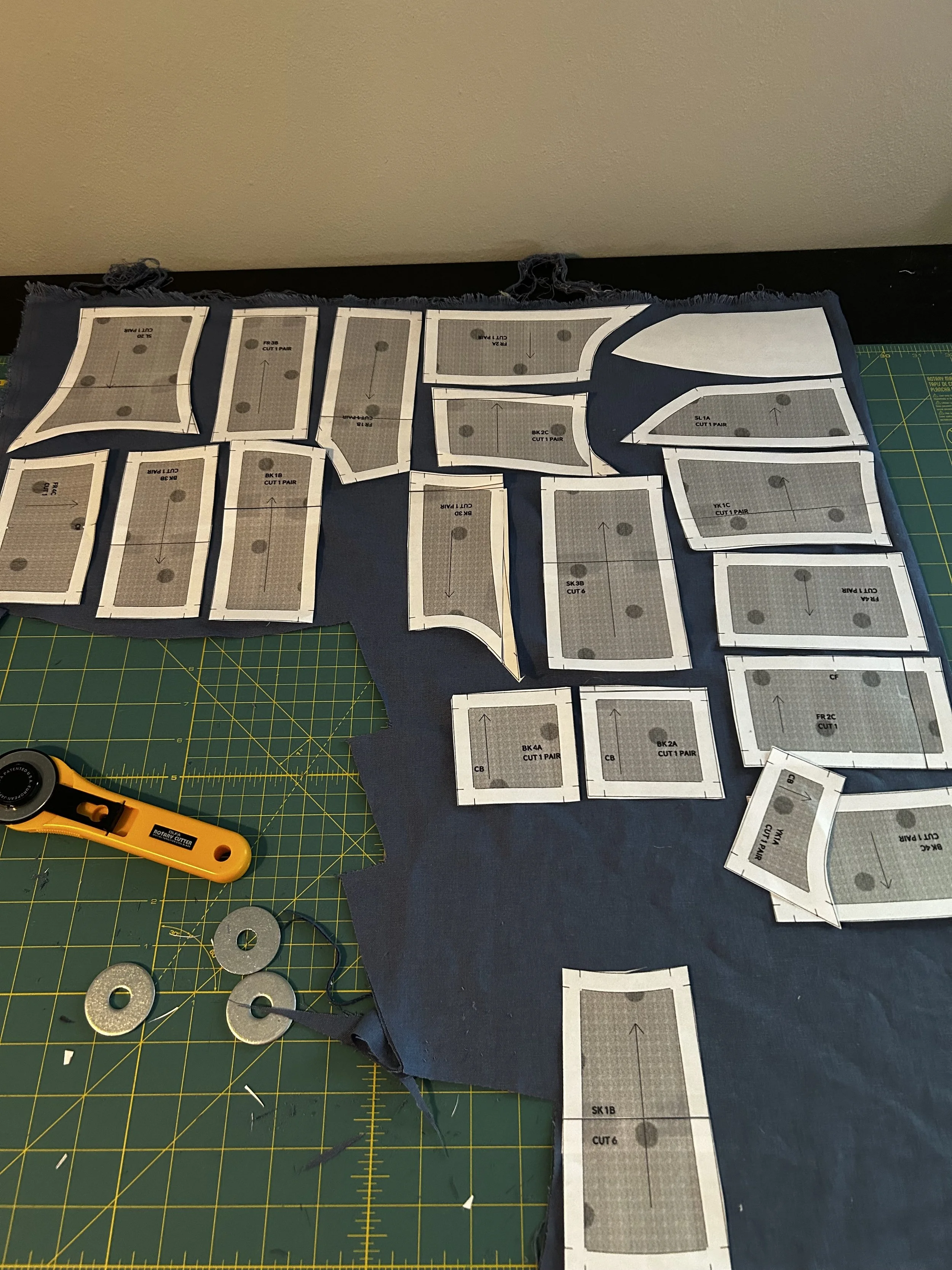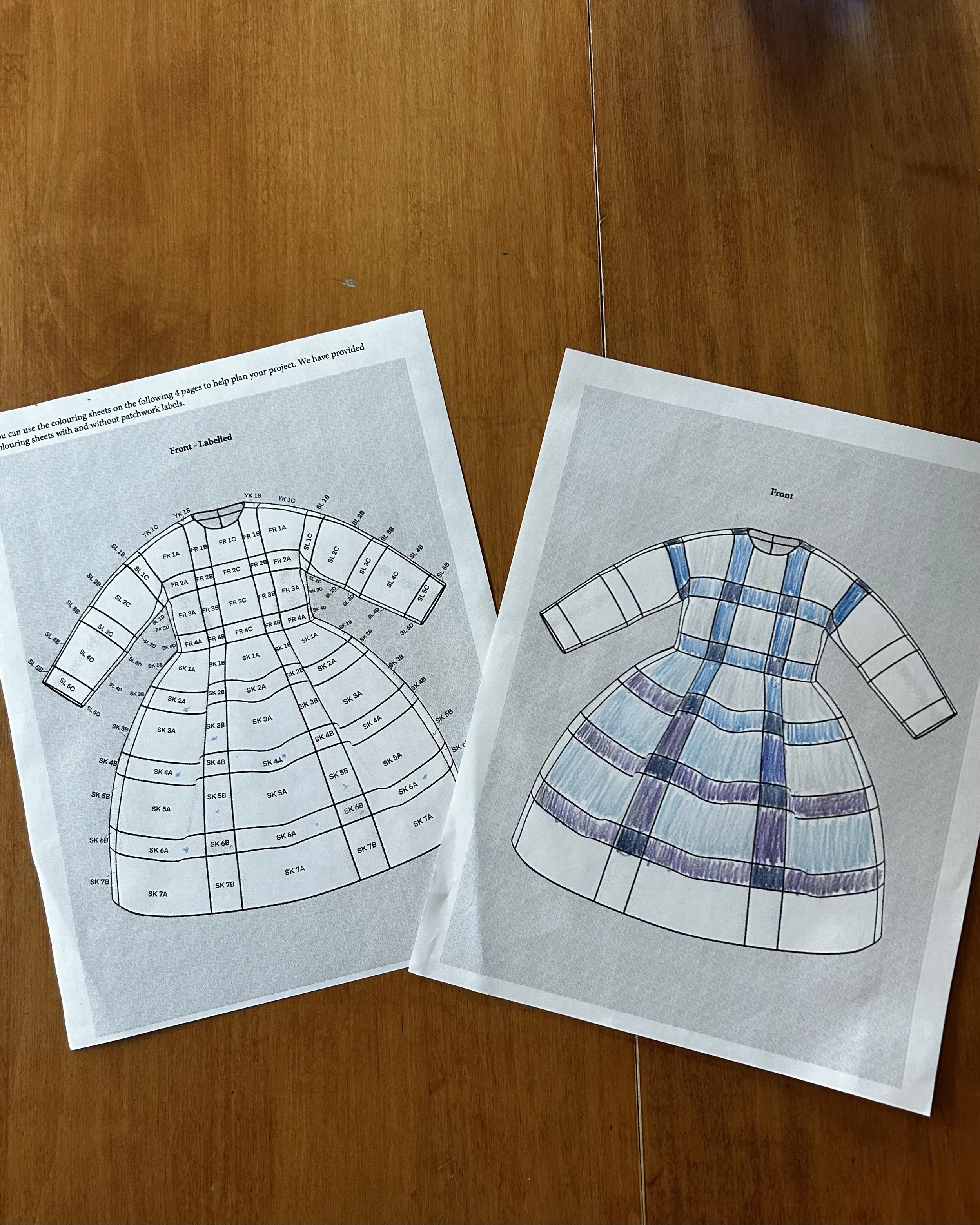 One challenge with cutting out from remnants is getting a straight grain- and some of my pieces felt a bit shifty- or off grain. I cut out and organized the pieces by top front and back, sleeves, and skirt front and back per pattern recommendations. The pattern instructions are comprehensive and first rate. I don’t follow sewing instructions closely when making a typical garment- but this pattern requires careful attention- the pattern instruction - 80 pages long including appendices- begin by suggesting you read the instructions first before starting- and I did that- although I admit skimmed parts.